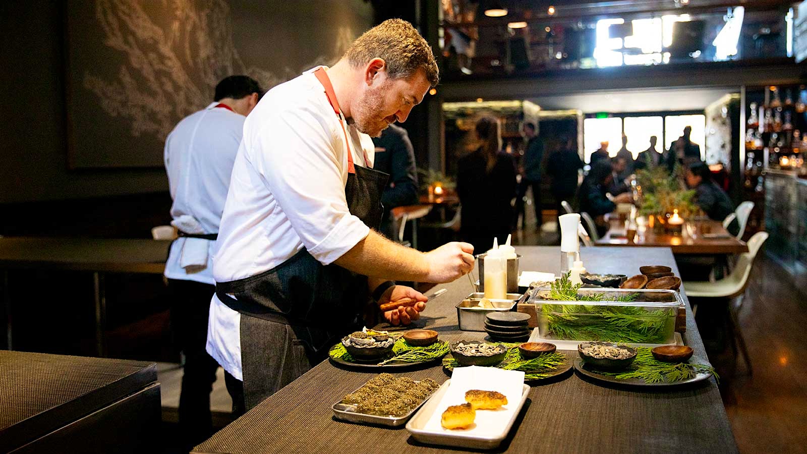 The meal is a multicourse journey through a local and seasonal lens. Thirty or more wild and foraged ingredients can be featured on any given night. A spring menu included a Mt. Lassen steelhead loin marinated in brown rice Shio koji, served with English peas, asparagus, wild pea shoots, ramps and foraged greens, including chickweed and miners lettuce. Preserved items from seasons past also show up: A trio of seafood bites included a broiled chignon oyster with fermented green garlic and a crispy, puffed trout skin with preserved alliums.