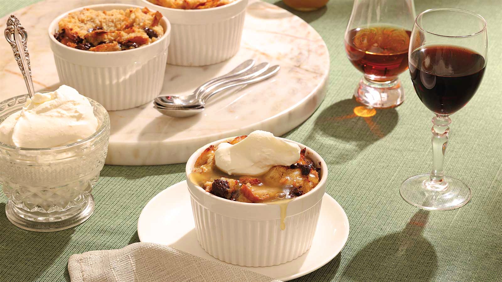 3. Melt the butter in a 4-quart baking pan. Pour in the bread pudding mix. Bake at 350° F., covered, 40 to 50 minutes, then uncover and bake 10 to 15 minutes until firm and slightly crusty on the top. Serve topped with Bourbon Sauce. Makes 16 servings.