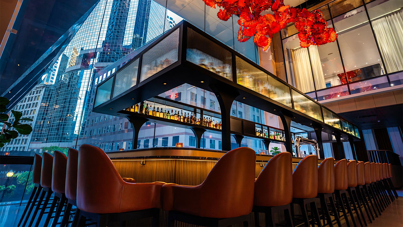 The space: The restaurant’s name comes from the ruby-red glass sculpture (called the Vermillion Fiori) by Dale Chihuly that floats above the bar in the center of the dining room. The space was designed in a sultry style by architect Thomas Jull-Hansen to harken back to the golden age of steak houses, mixing oak and leather elements with gold tones.—Julia Larson
